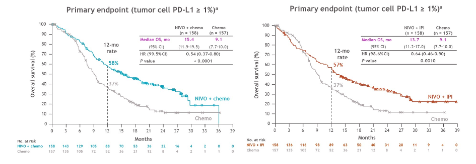 L’étude CheckMate 648 évaluait la combinaison nivolumab (Nivo) + ipilimumab (Ipi) ou Nivo + chimiothérapie (5FU plus cisplatine) versus chimiothérapie dans les CE de l’œsophage métastatiques ou avancés en 1ère ligne dans une population internationale (30% des patients non-asiatiques). Le co-critère principal de jugement était la SG et SSP dans la population avec un CPS≥1. Dans les deux cas la combinaison Nivo plus ipi ou nivo plus chimiothérapie permettait d’augmenter significativement la SG par rapport à la chimiothérapie seule (Figure 1). Il n’y avait pas de comparaison des groupes nivo plus ipi versus nivo plus chimiothérapie ; néanmoins l’association nivo + chimiothérapie a une médiane de SSP bien supérieure.