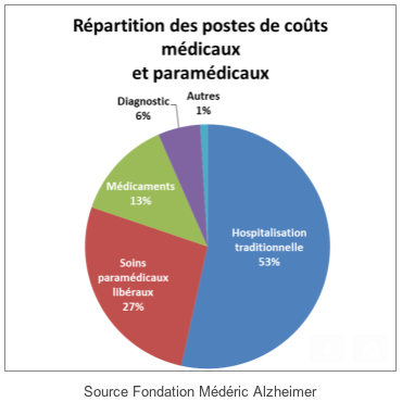 Les coûts médicaux et paramédicaux s'élèvent à 5,3 milliards d'euros par an. Ils correspondent à l'établissement du diagnostic, aux soins des personnes malades à leur domicile, à leur prise en charge en établissements de santé. Ils sont répartis ainsi : hospitalisation en médecine et chirurgie : 53 % ; soins paramédicaux libéraux en ville : infirmiers, orthophonistes, ergothérapeutes, psychologues, masseurs-kinésithérapeutes... : 27 % ; médicaments « anti-Alzheimer » : 13 % et enfin établissement du diagnostic (en libéral et en hospitalier) : 6 %.